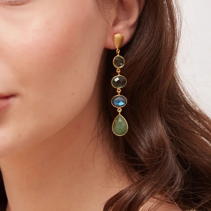 Bunter langer Ohrring, Gold, grüner Quarz und Aventurin